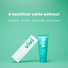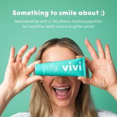 vivi toothpaste is fluoride-free and we prioritize ingredients that are safe, effective, derived from nature, and perfected by modern science. Key ingredients like Nano-Hydroxyapatite (n-Ha), Xylitol, Hydrated Silica, and Calcium carbonate work to strengthen enamel, fight cavities, and whiten teeth. We’ve also made sure to leave out toxins like fluoride, peroxide, and parabens, which are common in conventional toothpaste but unnecessary for great oral care. With some ingredients scientifically advanced for performance, me make sure that everything in our formula is biocompatible, gentle, and safe for sensitive teeth!"