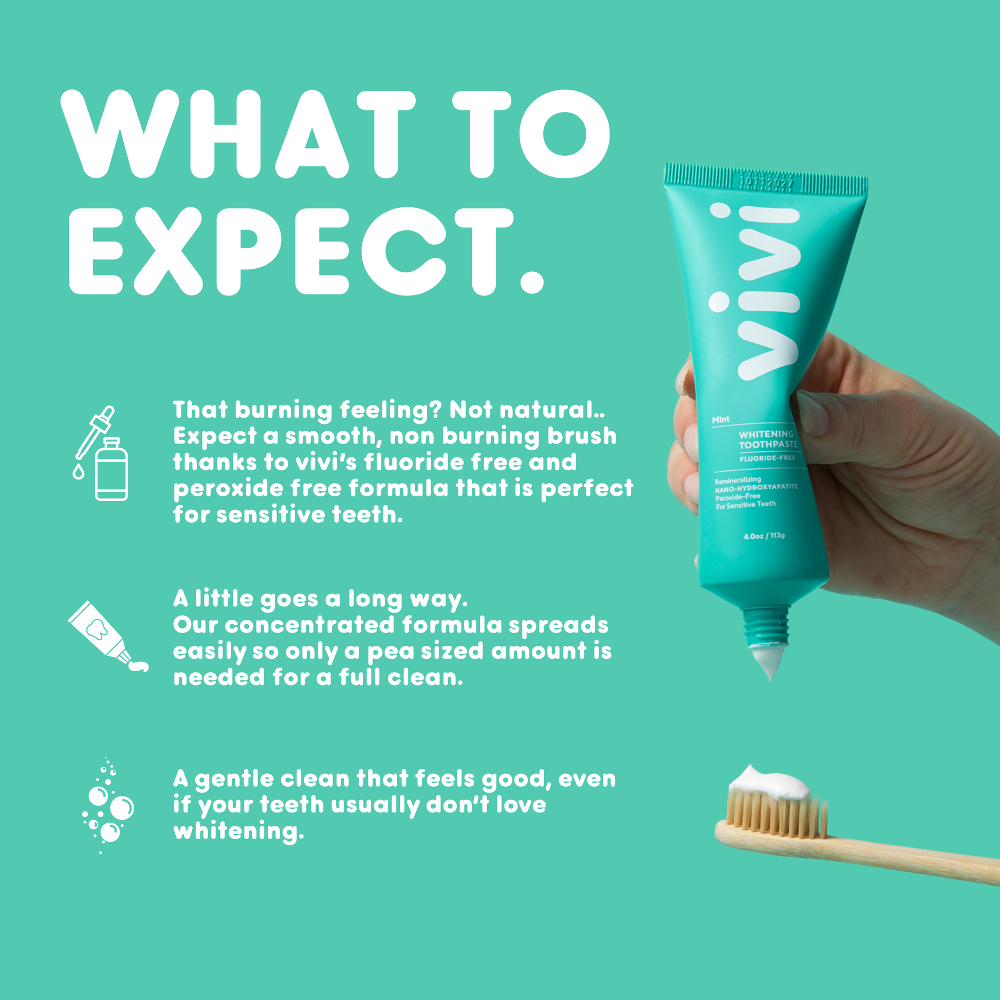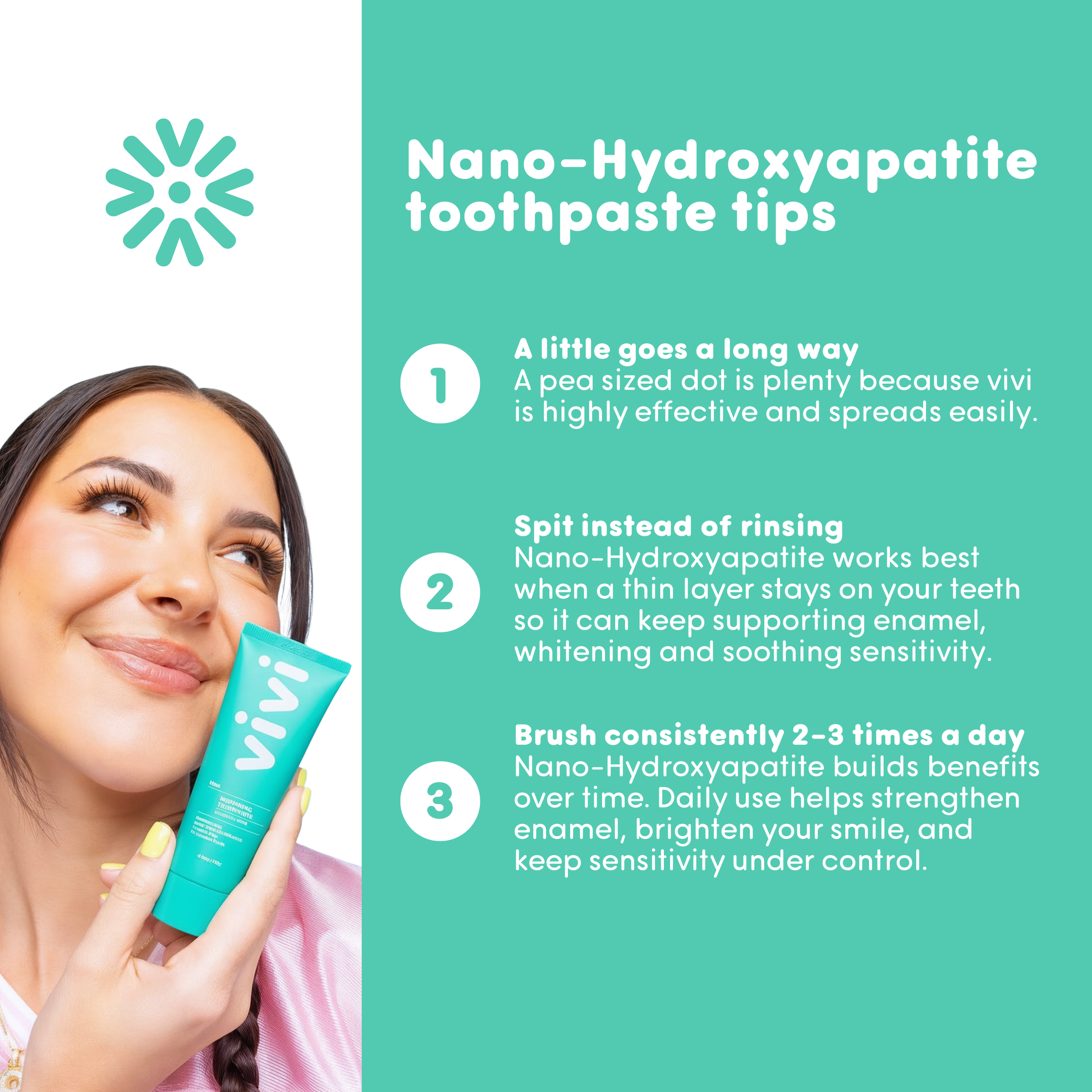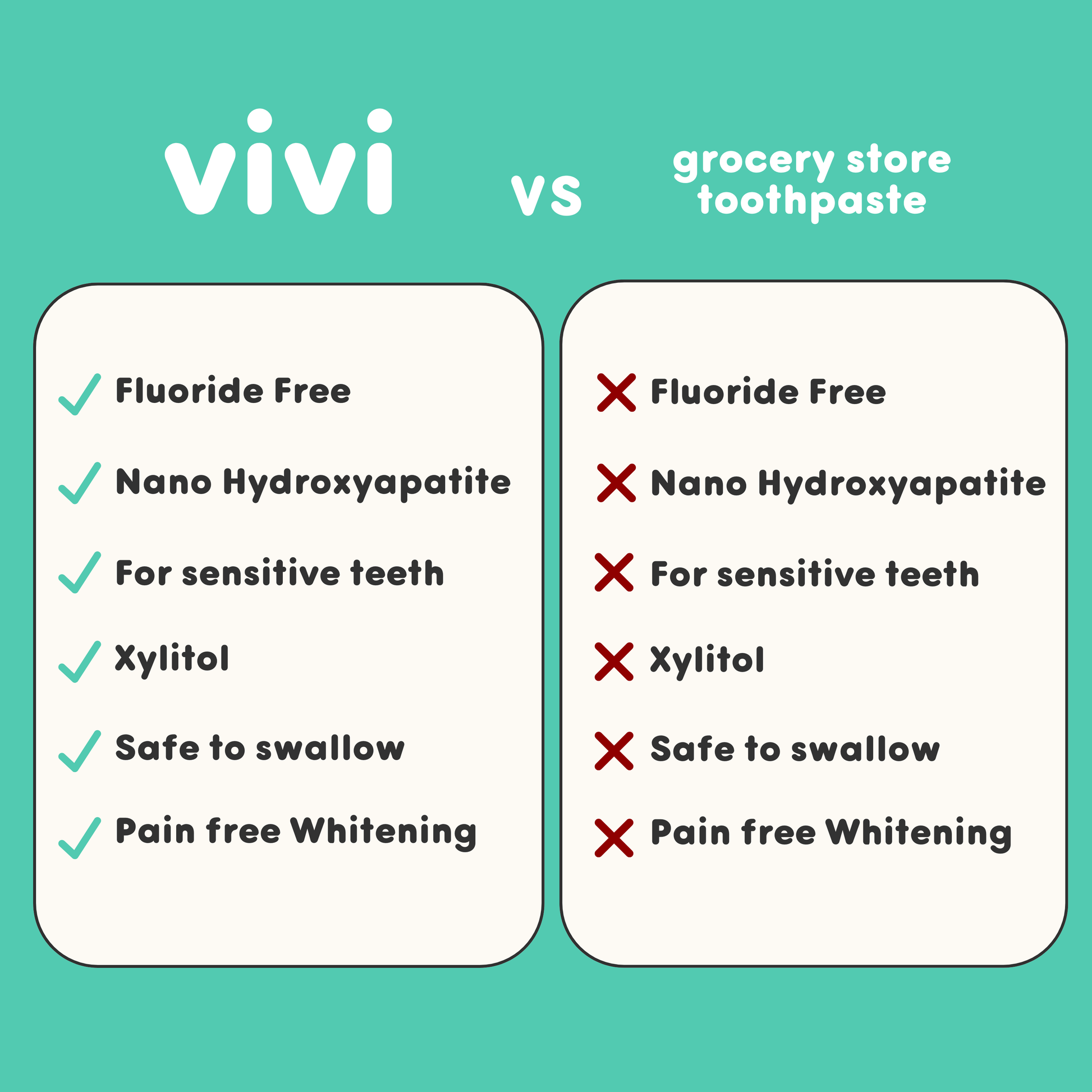 vivi toothpaste is fluoride-free and we prioritize ingredients that are safe, effective, derived from nature, and perfected by modern science. Key ingredients like Nano-Hydroxyapatite (n-Ha), Xylitol, Hydrated Silica, and Calcium carbonate work to strengthen enamel, fight cavities, and whiten teeth. We’ve also made sure to leave out toxins like fluoride, peroxide, and parabens, which are common in conventional toothpaste but unnecessary for great oral care. With some ingredients scientifically advanced for performance, me make sure that everything in our formula is biocompatible, gentle, and safe for sensitive teeth!"